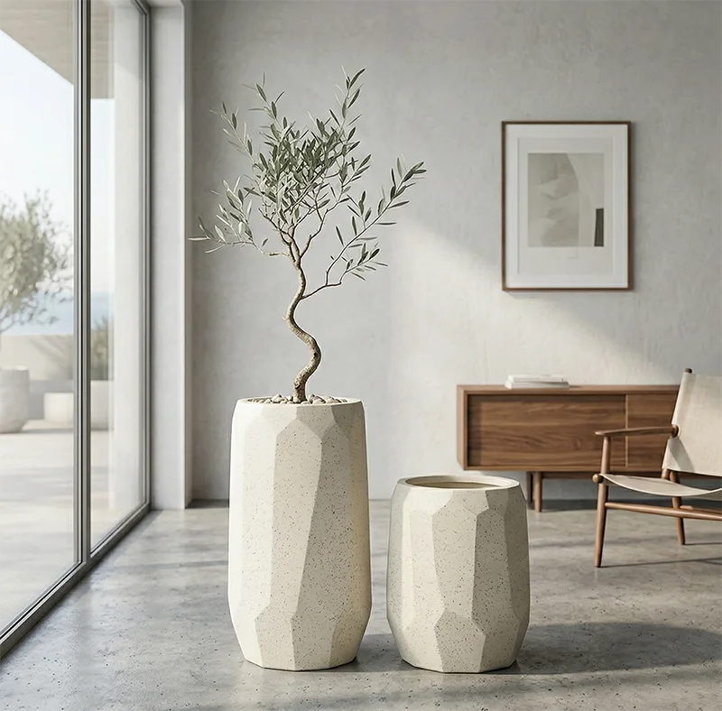 Ukrasna tegla za cvijeće 48×36 cm VIREO sand dostupna je i u manjoj dimenziji, što omogućuje estetski usklađene postave u paru ili grupi. Kombinacija različitih visina stvara dinamičan i elegantan izgled prostora, bilo u domu ili poslovnom okruženju.