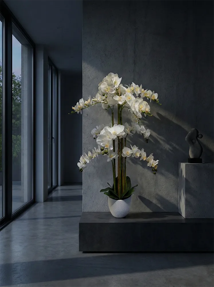 Kombinacija bijele orhideje i bijele posude stvara harmoničnu cjelinu koja djeluje smireno, a istovremeno iznimno sofisticirano. Zbog širine od 65 cm biljka ispunjava prostor na prirodan i uravnotežen način.